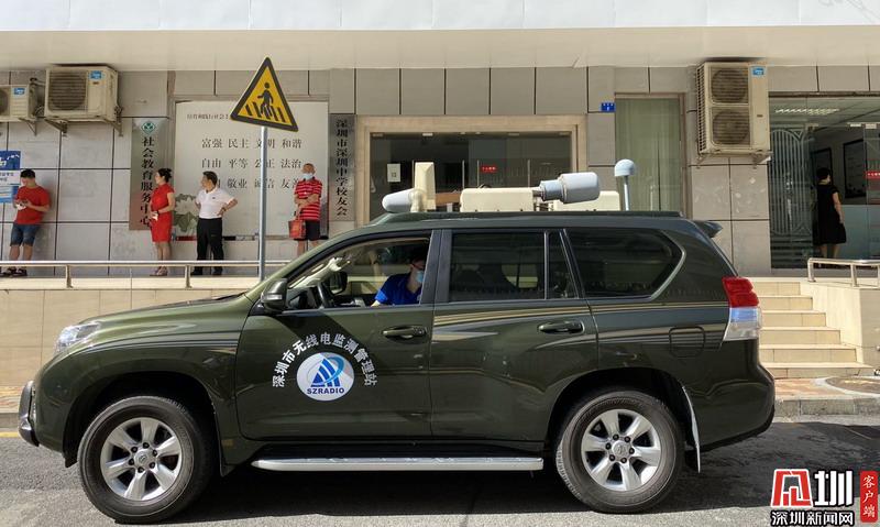 深圳中學(xué)考點(diǎn)外無線電監(jiān)測管理站工作車輛在現(xiàn)場進(jìn)行保障任務(wù)。