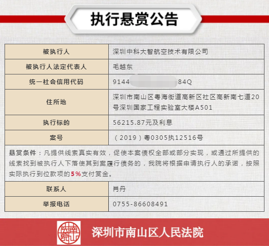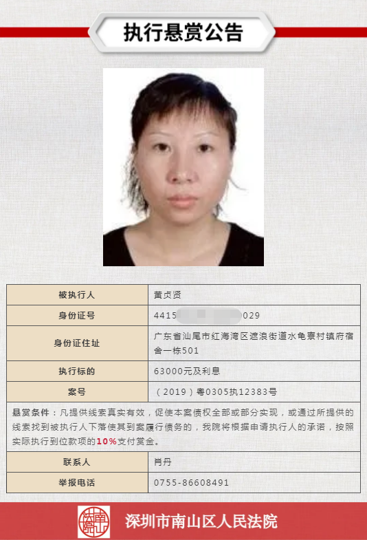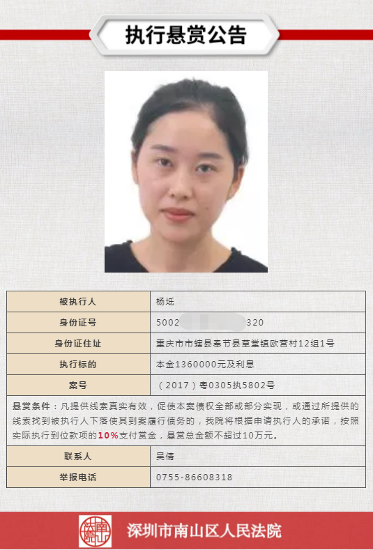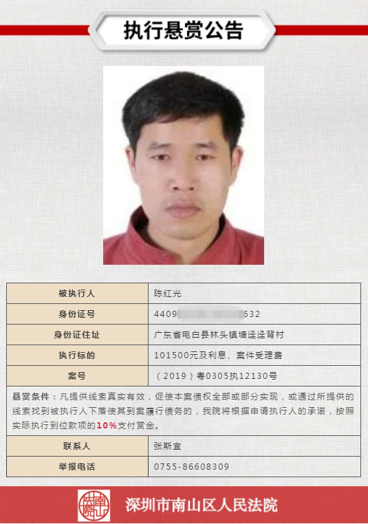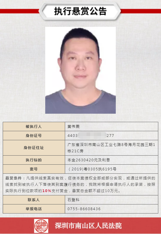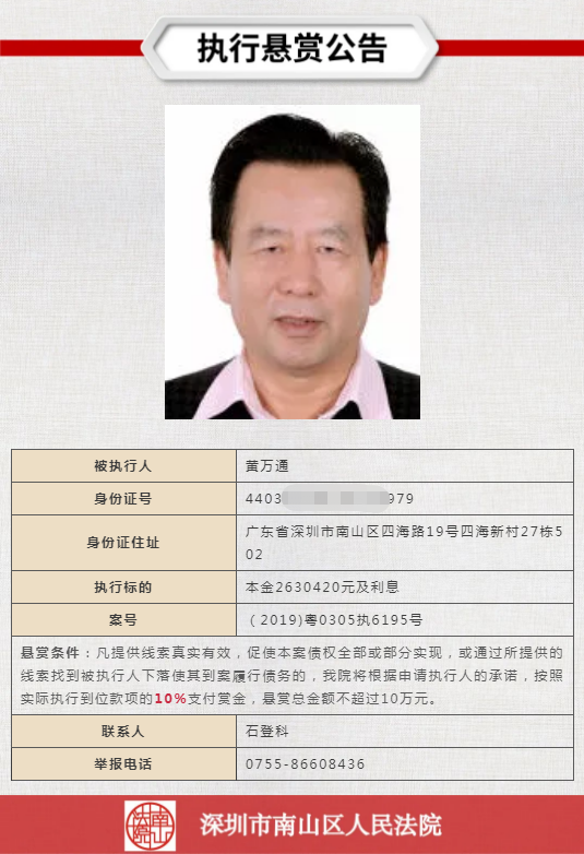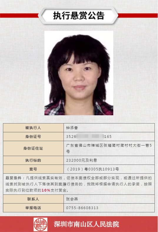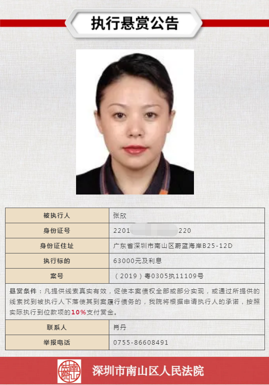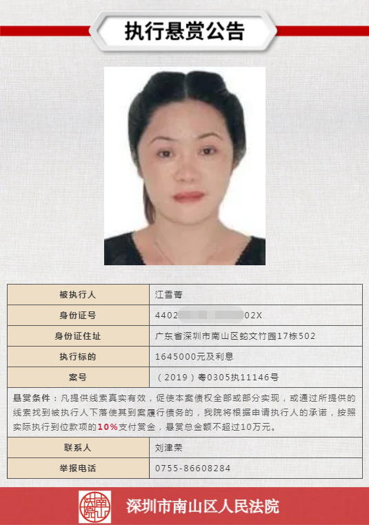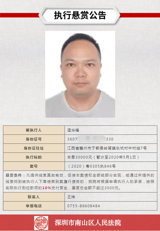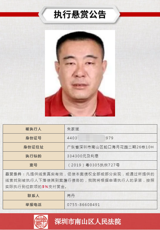經(jīng)申請執(zhí)行人申請,深圳市南山區(qū)人民法院向社會發(fā)布懸賞舉報公告,凡提供線索真實有效,促使本案債權(quán)全部或部分實現(xiàn),或通過所提供的線索找到被執(zhí)行人下落使其到案履行債務(wù)的,深圳市南山區(qū)人民法院將根據(jù)申請執(zhí)行人的承諾,按照實際執(zhí)行到位款項給予一定金額的賞金。