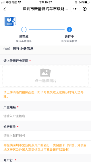 客戶需上傳銀行卡照片,并填寫(xiě)銀行賬號(hào)、開(kāi)戶行信息。開(kāi)戶行如不在選項(xiàng)范圍內(nèi)可選擇“其他”自填。其中,銀行賬號(hào)需為深圳市營(yíng)業(yè)網(wǎng)點(diǎn)開(kāi)戶的銀行一類儲(chǔ)蓄卡,華僑、港澳臺(tái)地區(qū)居民及外國(guó)人需提供深圳市建設(shè)銀行一類儲(chǔ)蓄卡。