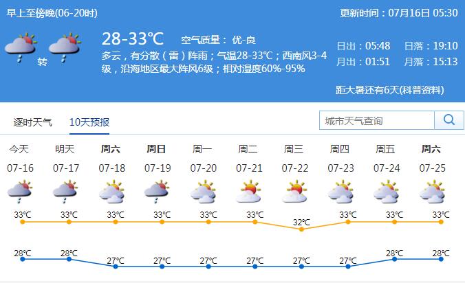 見圳客戶端·深圳新聞網(wǎng)2020年7月16日訊 未來一周天氣持續(xù)悶熱。16日多云間晴天,有分散(雷)陣雨;氣溫28-33℃,中北部地區(qū)最高氣溫35℃左右;西南風(fēng)3-4級(jí),沿海、高地和海區(qū)最大陣風(fēng)6級(jí);相對濕度55%-90%。17日多云,間中有分散(雷)陣雨;18-22日晴天間多云,局地偶有(雷)陣雨。