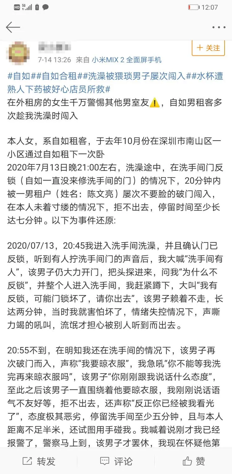 7月14日,梁女士在新浪微博發(fā)帖稱,她是南山某小區(qū)的自如租客,其在7月13日21時許的洗澡過程中,遭遇男性室友屢次闖入。根據(jù)梁女士描述,該男子態(tài)度惡劣,在梁女士未著寸縷的情況下在浴室停留時間長達數(shù)分鐘,其間還試圖伸手觸碰梁女士。梁女士回到房間后,向自如管家進行反饋并報警。
