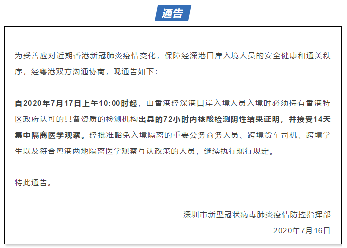 1、7月16日晚間,深圳市新型冠狀病毒肺炎疫情防控指揮部調(diào)整由香港經(jīng)深港口岸入境人員防控措施,由香港口岸入境人員須持72小時內(nèi)核酸檢測陰性結(jié)果證明,并接受14天集中隔離醫(yī)學觀察。