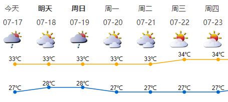 我市多云,局部有短時(雷)陣雨;氣溫27-33℃,中北部地區(qū)最高氣溫34-35℃;南風3-4級,陣風6級;相對濕度60%-95%。