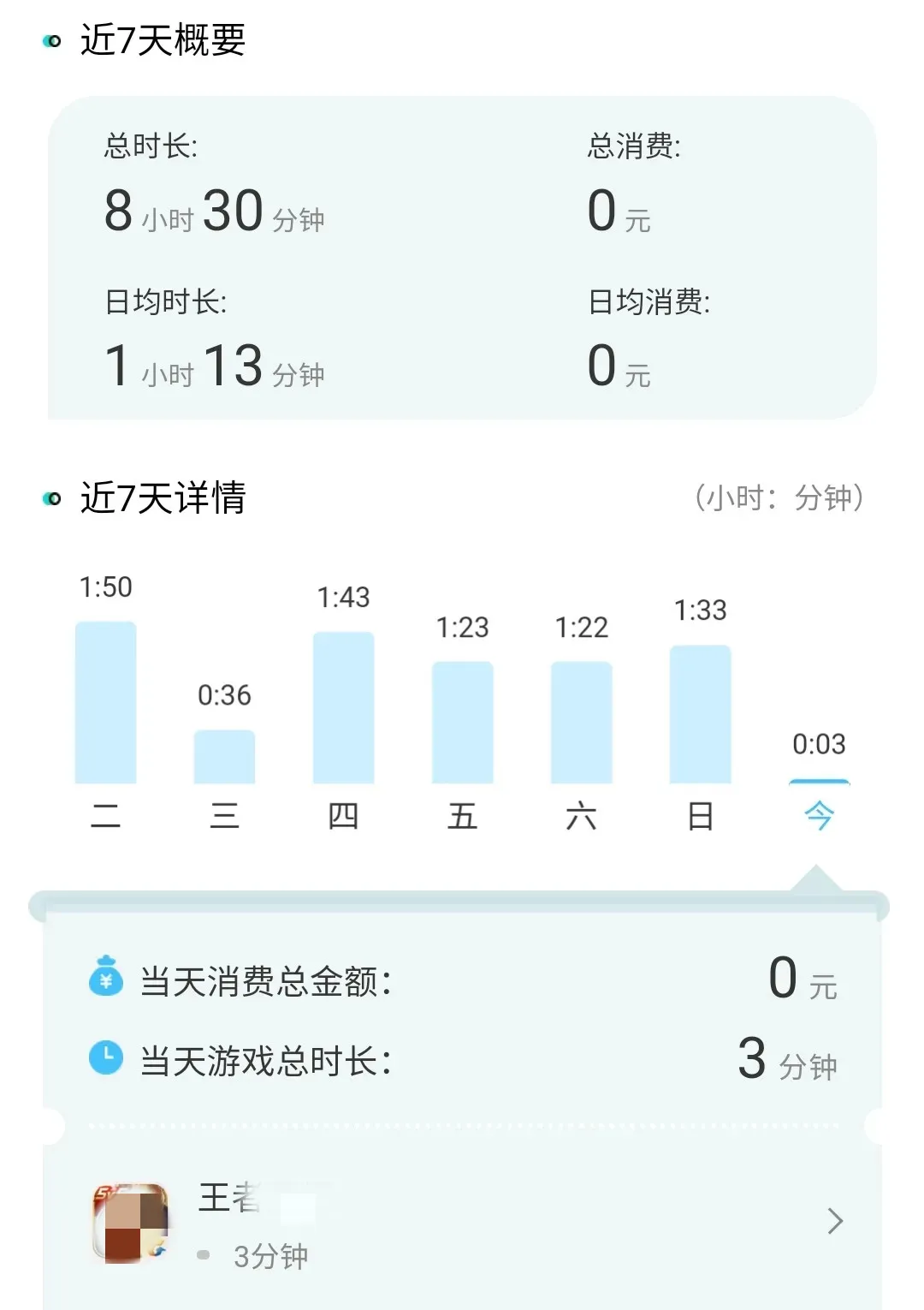 點(diǎn)擊進(jìn)入詳情頁,甚至還能看到最近7天的統(tǒng)計情況,總共玩多長時間,每天玩多長時間,每次登陸哪款游戲,登錄了多久,什么時候退出游戲……