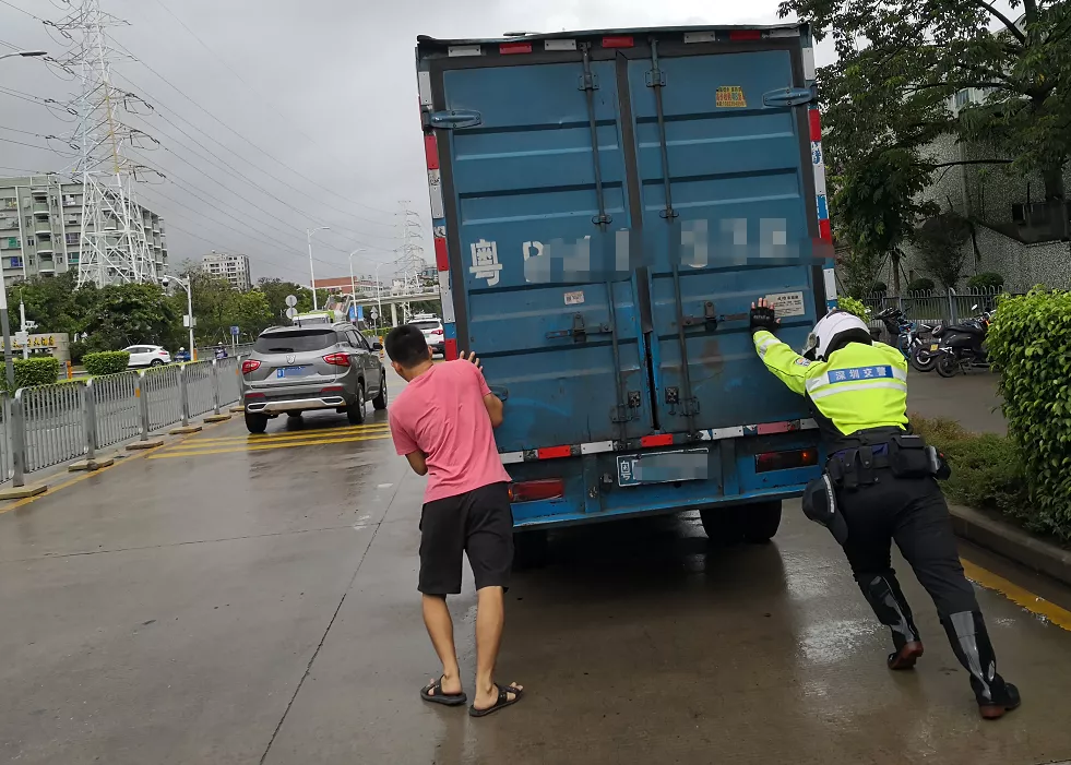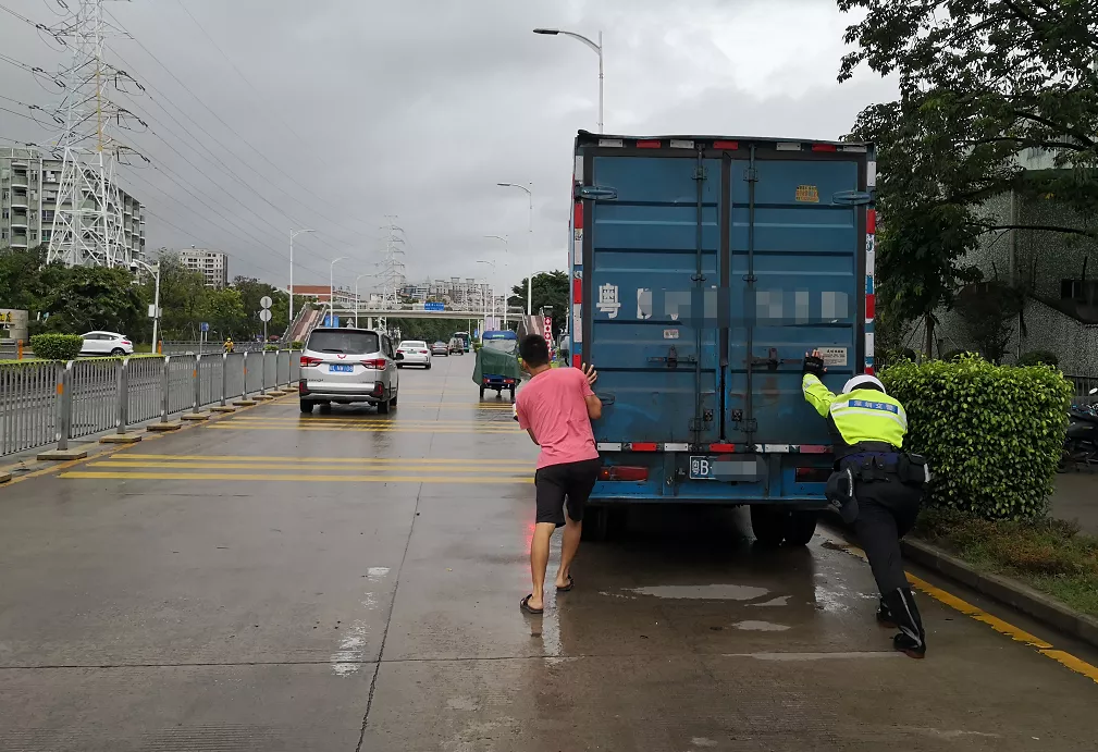 了解情況后,為緩解路面擁堵,避免產(chǎn)生交通事故,鐵騎隊員協(xié)助司機(jī)把車推到一邊等待救援。