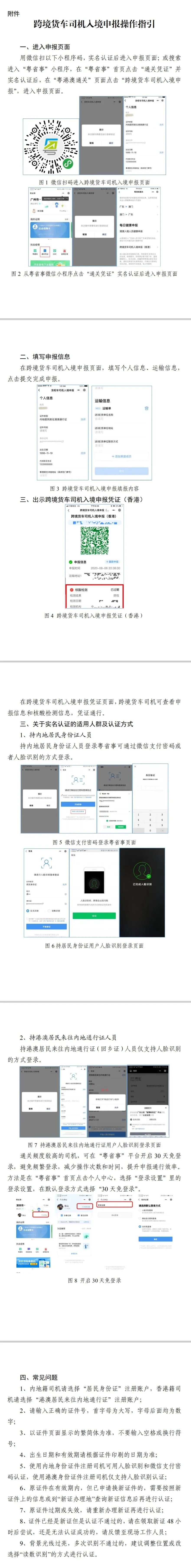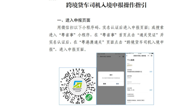 一、跨境司機入境前應在“粵省事”微信小程序(粵省事—粵康碼—粵港澳通關(guān)—跨境貨車司機入境申報)中準確申報運輸作業(yè)任務相關(guān)信息,包括作業(yè)目的地詳細信息(工廠/倉庫名稱及所在街道)、內(nèi)地手機號碼及相關(guān)個人信息,相關(guān)操作指引詳見附件。入境后所申報手機號碼將會接收提醒短信。未安裝GPS定位系統(tǒng)和ETC電子不停車收費系統(tǒng)的入境貨車,需按照相關(guān)部門安排前往指定場地免費安裝GPS和ETC系統(tǒng)。
