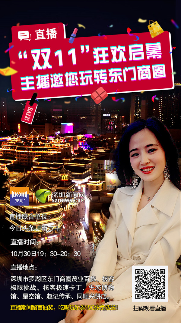 深圳新聞網(wǎng)訊(見圳客戶端、深圳新聞網(wǎng)記者 李慧 劉晨)提前探秘經(jīng)典活動“68小時不打烊”熱潮、體驗全亞洲最長的室內(nèi)索道、打卡失戀博物館、7D星空魔幻藝術(shù)館、走進手沖姜撞奶的原創(chuàng)品牌糖水店、品嘗深圳特產(chǎn)……10月30日(本周五)晚上7:30-8:30,由深圳新聞網(wǎng)聯(lián)合深圳市羅湖區(qū)融媒體中心共同打造,聯(lián)合今日頭條、南方+直播平臺,為市民開啟東門商圈狂歡預熱,解鎖“雙十一”嗨購方式,并在直播時段每隔20分鐘抽取一次幸運網(wǎng)友,發(fā)放免費150張吃喝玩樂禮品券。