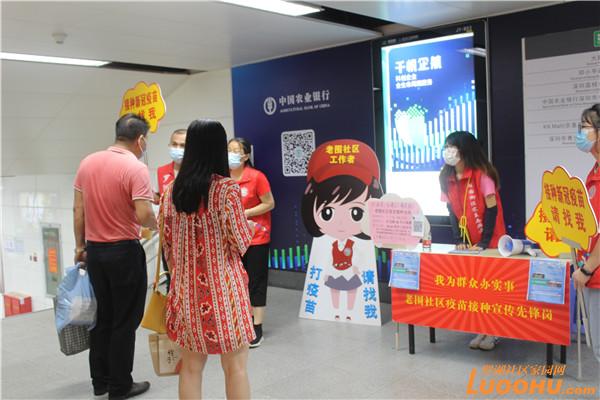 客運(yùn)繁忙的大劇院地鐵站就在老圍社區(qū),老圍社區(qū)黨委就把“疫苗接種宣傳先鋒崗”從小區(qū)卡口擴(kuò)展到地鐵口。在川流不息的地鐵口,宣傳崗上的大字“我為群眾辦實(shí)事,老圍社區(qū)疫苗接種宣傳先鋒崗”,金光閃閃格外醒目。旁邊的小喇叭循環(huán)播放:“接種疫苗人人有責(zé),打第二針疫苗請(qǐng)找我,不用排隊(duì)不用預(yù)約,專車接送?!?/p>