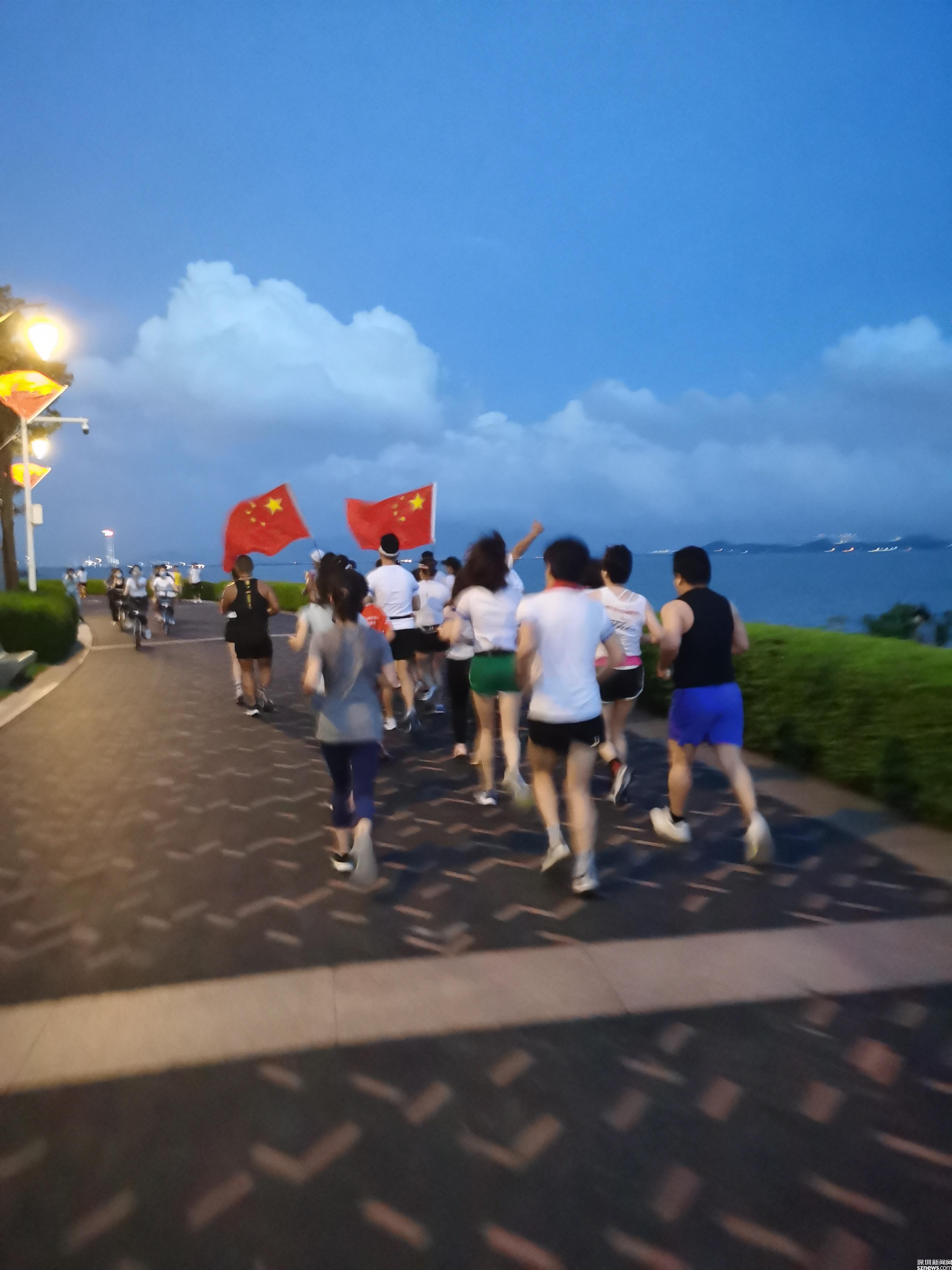 在海風習習的深圳灣,20個人排成三隊,在紅星紅旗的指引下,踏著統(tǒng)一的步伐,沿著海岸線跑了7.1公里。整齊的隊列,整齊的腳步聲,引起許多路人的關(guān)注和點贊。楊雨晨在心里唱著“沒有共產(chǎn)黨就就沒有新中國”,越跑越有力。