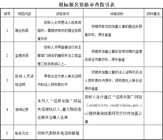 1.以上資格審查合格條件標(biāo)準(zhǔn)中如出現(xiàn)一處不符合要求,其投標(biāo)報名將不被接受;
