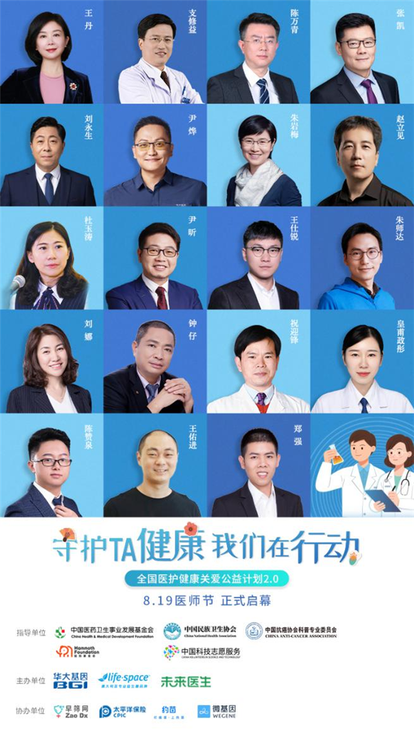 此次公益由中國醫(yī)藥衛(wèi)生事業(yè)發(fā)展基金會、中國民族衛(wèi)生協(xié)會、中國抗癌協(xié)會科普專業(yè)委員會、深圳猛犸公益基金會等機構(gòu)指導(dǎo),華大基因、Life-Space、未來醫(yī)生聯(lián)合主辦,早篩網(wǎng)、太平洋保險、約苗、微基因協(xié)辦,通過健康關(guān)懷禮包捐贈、公益科普直播、線上義診等系列活動,呼吁全社會關(guān)愛醫(yī)護(hù)人員,助力全社會形成“尊醫(yī)重衛(wèi)”的文化和氛圍;同時借助公益影響力,讓關(guān)愛輻射更廣泛人群,提高全民“早篩、早診、早治”的健康意識,助力健康中國。
