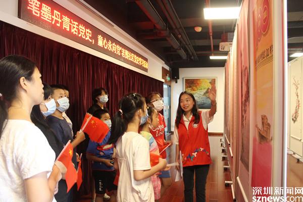 在10對親子家庭中,有跟媽媽一起來的,也有姐姐帶著弟弟妹妹來的;有二年級的小學生,也有剛上初三的中學生。無論大人還是孩子,都被一幅幅精彩的書畫作品吸引,“紅船”“井岡山”“延安”“紅軍長征經(jīng)過的雪山”……這些百年黨史中必不可少的故事,讓小朋友們睜大了雙眼、豎起了耳朵。他們盯著畫作,聽著社工的講解投入其中,現(xiàn)場氣氛熱烈。
