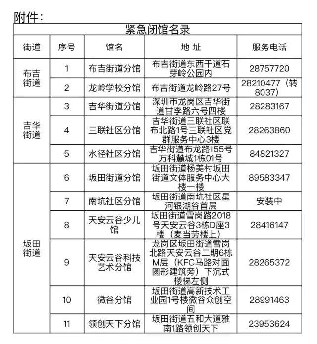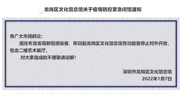 1月7日,深圳市龍崗區(qū)圖書館發(fā)布通知稱,因疫情防控工作需要,為保障市民讀者健康安全,經(jīng)研究決定,區(qū)圖書館在布吉、坂田和吉華三個街道的所有分館,自2022年1月7日起臨時閉館,暫停到館讀者服務和各項活動,進行衛(wèi)生消殺、內(nèi)務整理等,恢復開館時間另行通知。