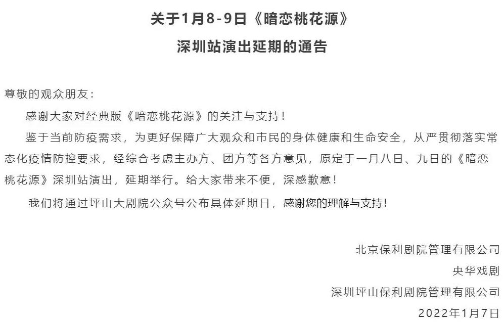 為配合疫情防控要求,減少因人群聚集帶來的病毒傳播風險,切實保障人民群眾生命安全,原定于2022年1月7日19:30在深圳戲院劇場(一號廳)舉行的大型粵劇《情僧偷到瀟湘館》演出取消,敬請知悉。