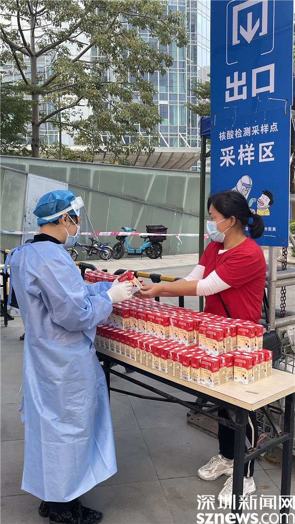在筍崗街道初心公園核酸檢測點(diǎn),市民在進(jìn)行核酸檢測后可以去領(lǐng)取一瓶牛奶。據(jù)了解,這是深圳愛心企業(yè)專門為市民和醫(yī)護(hù)人員捐贈(zèng)的,這一瓶瓶牛奶在深圳的冬天向醫(yī)護(hù)人員和市民送上了一份溫暖。