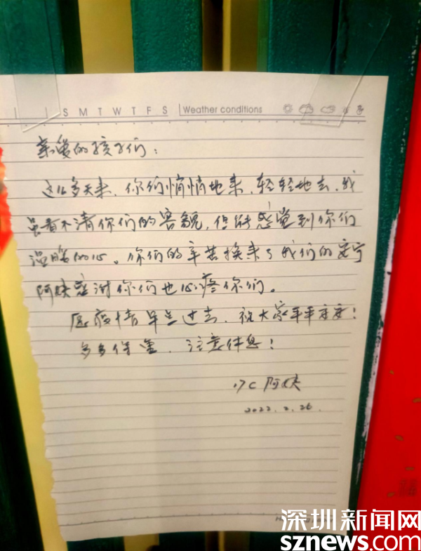 “親愛的孩子們,這么多天來,你們悄悄地來,輕輕地去,我雖看不清你們的容顏,但能感受到你們溫暖的心。你們的辛苦換來了我們的安寧,阿姨感謝你們也心疼你們。”這是來自桂園街道華瑞大廈B座居民的手寫感謝信,一句“親愛的孩子們”戳中了現(xiàn)場工作人員的心,讓人忍不住淚目。