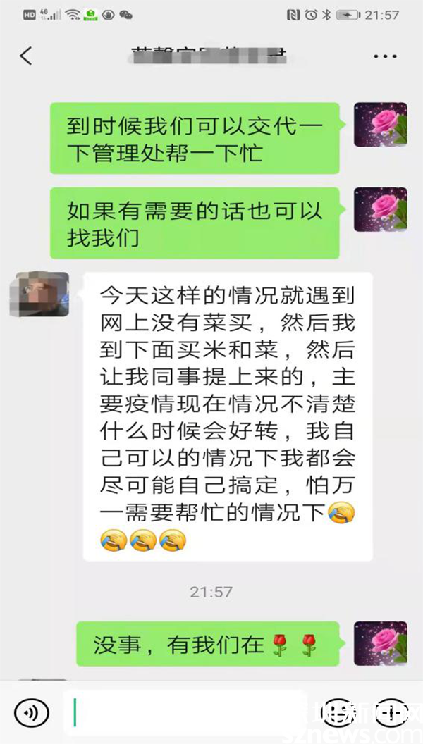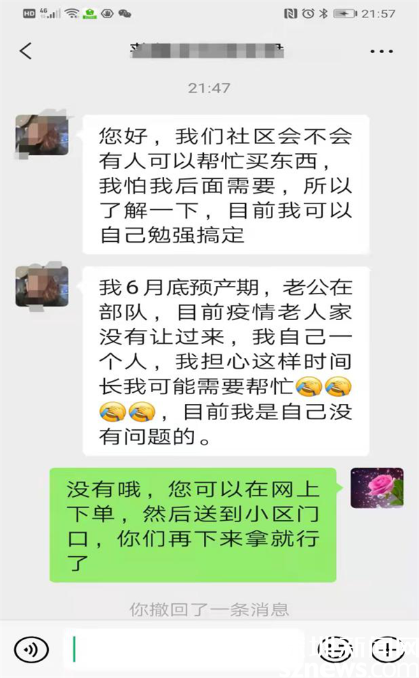 3月13日晚近十點(diǎn),家住蓮塘街道蓮馨家園的黃女士通過(guò)微信向畔山社區(qū)黨委副書(shū)記鄒紅梅求助,詢問(wèn)社區(qū)能否在自己待產(chǎn)不方便的情況下幫助購(gòu)物送貨……。原來(lái),黃女士預(yù)產(chǎn)期在6月份,丈夫在部隊(duì)服役,因?yàn)橐咔樵颍抑欣先藷o(wú)法過(guò)來(lái)深圳照顧,只能自己在家休養(yǎng),心理壓力較大顧慮較多。了解到情況后,鄒紅梅耐心疏導(dǎo)黃女士焦慮和恐慌情緒,說(shuō)明社區(qū)的關(guān)愛(ài)措施,并微信回復(fù)說(shuō),“需要幫忙,可以找我們。放心吧,有我們?cè)??!?/p>