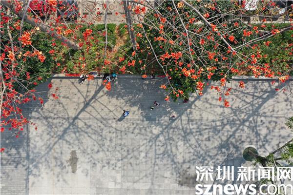 赤焰灼灼的木棉花開了,染紅了轄區(qū)半邊天際,與深圳藍(lán)相映成趣。一朵朵嫣紅的花兒垂?jié)M枝頭,沐浴著暖春的陽光綻放,也點(diǎn)綴著花下賞花的居民們。