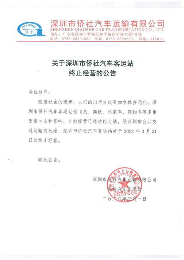 近日,記者從深圳市交通運(yùn)輸局羅湖管理局獲悉,自2022年3月31日起,深圳市僑社汽車(chē)客運(yùn)站終止經(jīng)營(yíng),這個(gè)營(yíng)業(yè)了31年的“老牌”汽車(chē)客運(yùn)站,正式宣布退休。
