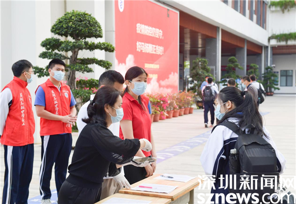 當(dāng)天早上,在羅湖高級中學(xué)校門口,學(xué)校老師、校醫(yī)、義工家長等早早來到校門口,迎接同學(xué)們的到來,每個(gè)同學(xué)都自覺戴好口罩,間隔一米距離,背著書包,拖著行李箱,進(jìn)入學(xué)校前出示校卡、粵康碼綠碼、行程卡以及24小時(shí)核酸陰性證明,并進(jìn)行衣物、行李、鞋底和手部消毒等。在經(jīng)歷了長達(dá)一個(gè)多月的線上課程后,同學(xué)們終于返回闊別已久的校園。突然開學(xué)是怎樣的心情?讓我們一起跟隨鏡頭直擊現(xiàn)場。