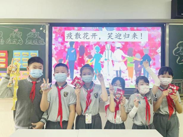 502班的返校儀式“愛(ài)意濃濃”。紅色拉花讓每個(gè)孩子都喜氣洋洋;桌上班主任老師親手折的小禮盒和各式各樣的糖果讓孩子們甜蜜加倍;還有暖心“紅包”,里面有老師們一筆一畫(huà)書(shū)寫(xiě)給孩子們的驚喜,更是寄托了無(wú)限的關(guān)心與激勵(lì)。