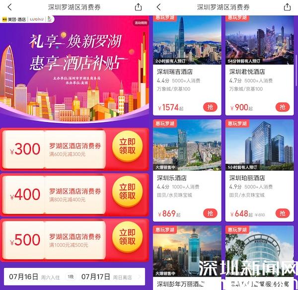 讀特客戶端·深圳新聞網2022年7月16日訊(記者 覃鈺清)7月16日,羅湖區(qū)會同羅湖區(qū)酒店行業(yè)協(xié)會、美團推出“禮享煥新羅湖,惠享酒店補貼”活動,投入33萬扶持資金,用于支持酒店、住宿消費。消費者可在美團APP搜索“羅湖消費券”、“羅湖酒店消費券”等關鍵詞進入活動頁面,點擊“領取”按鈕即可獲得。本次優(yōu)惠額度包括:滿1000元減500元、滿800元減400元、滿600元減300元,最高五折優(yōu)惠,可在羅湖轄區(qū)內40余家酒店使用。