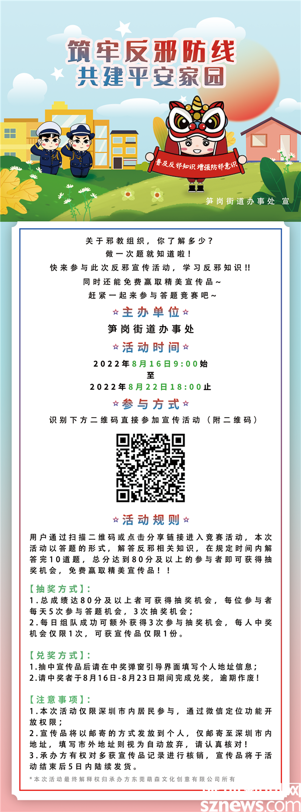 為做好反邪教警示教育宣傳工作,引導(dǎo)轄區(qū)內(nèi)居民進(jìn)一步認(rèn)清邪教危害,提高反邪教意識和能力,營造“無邪羅湖、和諧社區(qū)”濃厚氛圍,筍崗街道持續(xù)開展以“防范邪教侵害、守護(hù)平安家園”為主題的反邪教宣傳系列活動,實(shí)現(xiàn)反邪教宣傳全覆蓋。
