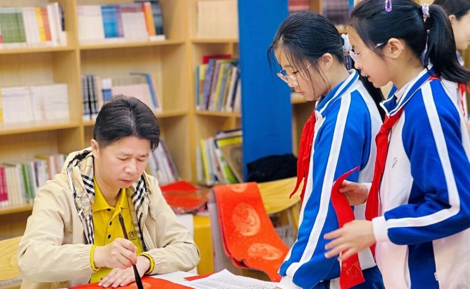 儀式結(jié)束后,師生與家長代表有序移步圖書館。館內(nèi)“大鵬書協(xié)進(jìn)溪小,名家揮毫送萬福”“書香溪涌,翰墨迎春”等主題標(biāo)語格外醒目,營造出雅致溫馨的書寫氛圍。書法家鋪紙研墨,即興揮毫,一副副春聯(lián)、一張張“?!弊衷诠P尖流淌,承載著對(duì)新年安康、學(xué)業(yè)進(jìn)步、家庭和睦的美好祝愿。