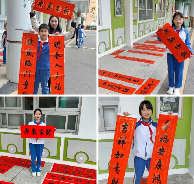 墨香裊裊中,師生們有序駐足,凝神觀摩名家運(yùn)筆,細(xì)細(xì)品味點(diǎn)畫間的氣韻流轉(zhuǎn)。每當(dāng)一幅作品完成,孩子們便小心接過,雙手輕托著墨跡未干的春聯(lián)與“?!弊?,鄭重地將它們送至晾曬區(qū)。一時(shí)間,長廊里鋪開一片喜氣的紅,映照著一張張專注而欣喜的臉龐。無論師生,皆有所獲,“人人有份,個(gè)個(gè)開心”的滿足感,讓這個(gè)上午的空氣里都浮動(dòng)著暖意。筆墨與祝福,在指尖與目光間傳遞,化為一份份可觸、可感、可帶回家的文化禮物。
