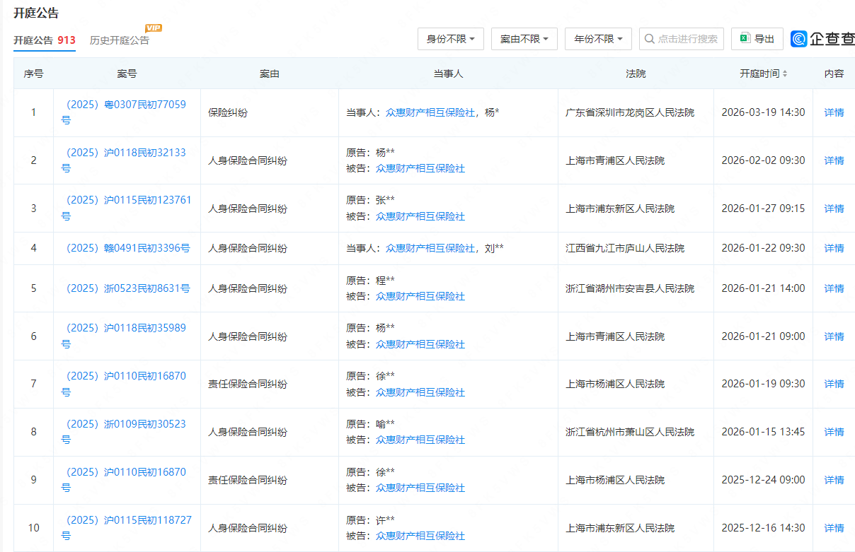 記者梳理發(fā)現(xiàn),僅2025年,眾惠財(cái)險(xiǎn)在單個線上投訴平臺的投訴量就超過3000次,企查查數(shù)據(jù)顯示其近期開庭量達(dá)數(shù)十起,這場“低價(jià)攬客”的營銷鬧劇,正在持續(xù)侵蝕消費(fèi)者權(quán)益與行業(yè)信任。