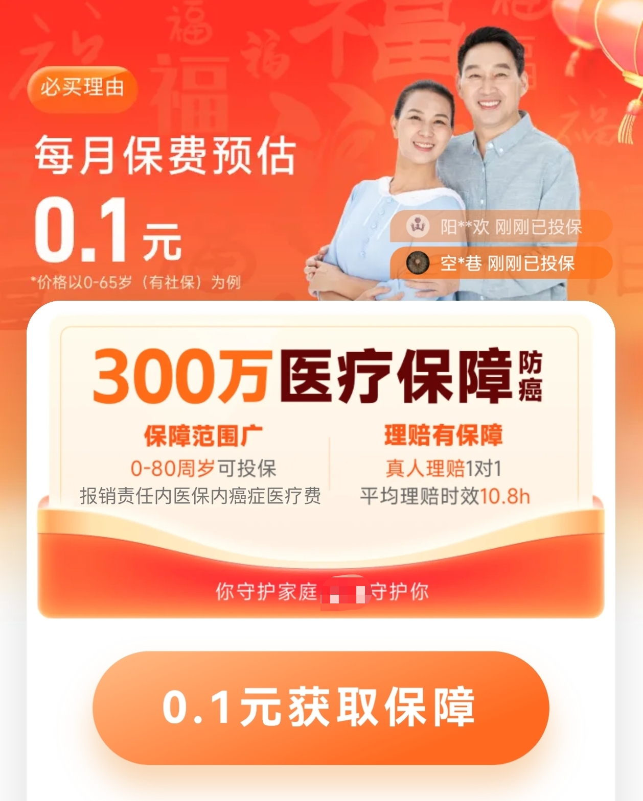 投保頁面設(shè)計(jì)充滿“巧思”:“300萬醫(yī)療保障”“0-80周歲可投”“真人1對1理賠”等大字宣傳格外醒目,與“0.1元”的低價(jià)形成極強(qiáng)的性價(jià)比反差,讓消費(fèi)者產(chǎn)生“花小錢辦大事”的錯覺。