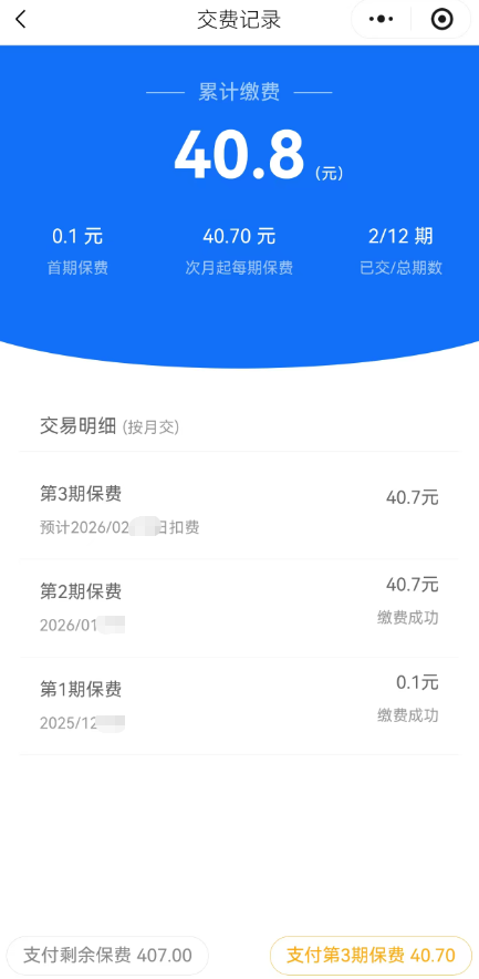 點(diǎn)擊“獲取保障”完成投保后的劉先生才發(fā)現(xiàn):所謂“0.1元”獲取的保障僅為“特惠版”,且并不是0.1元而是需要每月分期付款,產(chǎn)品保障單一,免賠額還高達(dá)5萬元。更令劉先生驚訝的是,投保次月他的保費(fèi)扣款就從0.1元陡然變成了40.7元,一年算下來其實(shí)是花了447.8元購買了一份醫(yī)療險(xiǎn)。