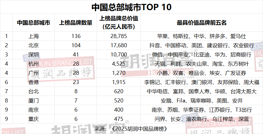 區(qū)域分布上,中國總部城市聚集效應(yīng)顯著,長三角、京津冀、粵港澳大灣區(qū)三大經(jīng)濟(jì)帶合計(jì)占據(jù)全榜83%的品牌數(shù)量。上海以136個(gè)上榜品牌居首,總價(jià)值近2.9萬億元;北京以104個(gè)品牌緊隨其后,總價(jià)值近1.8萬億元;深圳位列第三,擁有41個(gè)品牌,總價(jià)值接近1.1萬億元;杭州、廣州(各28個(gè))、香港(23 個(gè))構(gòu)成第二梯隊(duì),前六城市貢獻(xiàn)了榜單超七成的品牌數(shù)量。