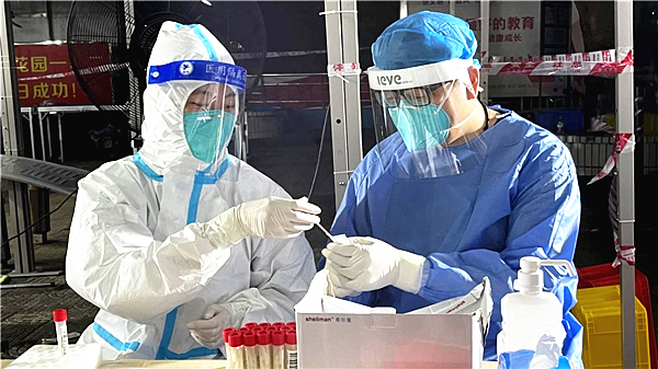 6月20日下午,在深圳市羅湖區(qū)東湖街道布心花園核酸檢測點(diǎn),羅湖區(qū)婦幼保健院兒童保健科康復(fù)治療師李忠麗在核酸檢測現(xiàn)場突發(fā)暈眩,隨即被扶至一旁休息,隨后由其丈夫羅湖區(qū)婦幼保健院兒童保健科康復(fù)治療師任雨替補(bǔ)上陣。