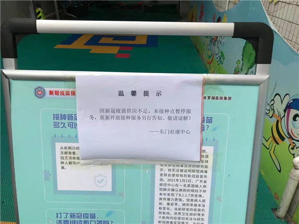 4月6日,記者在羅湖區(qū)東門(mén)社康中心看到,該社康貼出了疫苗暫時(shí)供應(yīng)不足的告知。記者隨后走訪了其他幾個(gè)接種點(diǎn),一些社康也紛紛貼出了類(lèi)似溫馨提示。記者了解到,除羅湖外,其他區(qū)的接種點(diǎn)也出現(xiàn)了類(lèi)似“缺苗”現(xiàn)象。對(duì)此,記者采訪了羅湖區(qū)衛(wèi)健局,相關(guān)負(fù)責(zé)人表示,這段時(shí)間轄區(qū)新冠病毒疫苗接種率大幅提升,目前缺苗只是暫時(shí)性的,正在加強(qiáng)調(diào)配,隨時(shí)可能到苗,請(qǐng)大家耐心等待,同時(shí)留意相關(guān)提示。