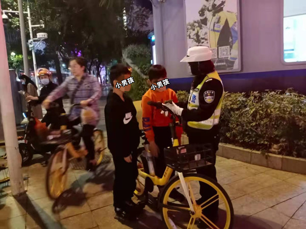2月1日晚,羅湖交警大隊東門中隊警輔隊員曾惠珍執(zhí)勤時發(fā)現(xiàn)兩名10歲左右的小男孩在主干道深南大道上嬉笑打鬧,一名男孩騎行共享單車,另一名男孩跟在自行車后面跑動,全然不顧路上疾馳的車輛。