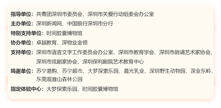 讓閱讀成為動人的風(fēng)景,讓故事的魅力感動深圳。為助力建設(shè)良好的青少年閱讀環(huán)境,激發(fā)學(xué)生閱讀興趣,倡導(dǎo)親子閱讀,共建和諧家庭關(guān)系。2020年,第二十一屆深圳讀書月主題活動“誰是故事大王·第四季”在共青團(tuán)深圳市委員會、深圳市關(guān)愛行動組委會辦公室的指導(dǎo)下再出發(fā)。更長的活動周期,更豐富的參與形式,更專業(yè)的賽制,“誰是故事大王·第四季”等你來解鎖與挑戰(zhàn)!