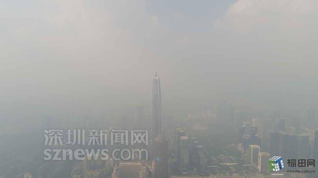 無(wú)人機(jī)在數(shù)百米高空俯瞰灰霾籠罩下的深圳中心區(qū),大半個(gè)城區(qū)都看不清楚。