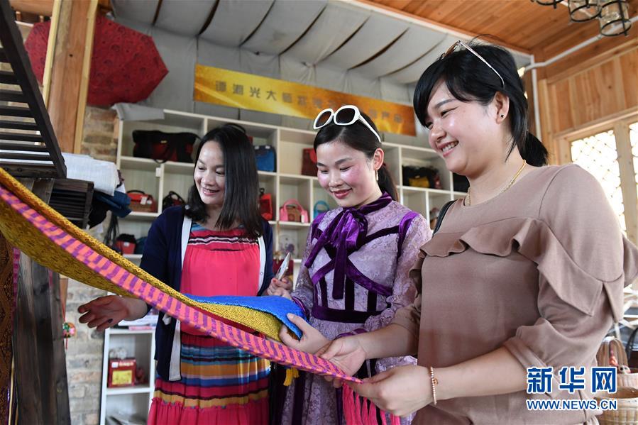 4月19日,在廣西南寧市青秀區(qū)南陽(yáng)鎮(zhèn)施厚村古岳坡,游客在參觀(guān)用于制作民族工藝品的布料。今年“壯族三月三”假期期間,不少市民游客前往鄉(xiāng)村旅游觀(guān)光,激發(fā)了一股鄉(xiāng)村旅游小熱潮。“壯族三月三”是廣西壯族自治區(qū)確定的法定假期。新華社記者陸波岸 攝