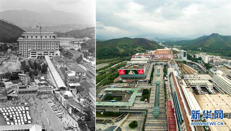拼版照片:左圖為當年深圳新建的聯(lián)檢大樓(資料照片,新華社記者盧炳輝攝);右圖為2018年6月12日無人機拍攝的羅湖口岸聯(lián)檢大樓片區(qū)(新華社記者毛思倩攝)。