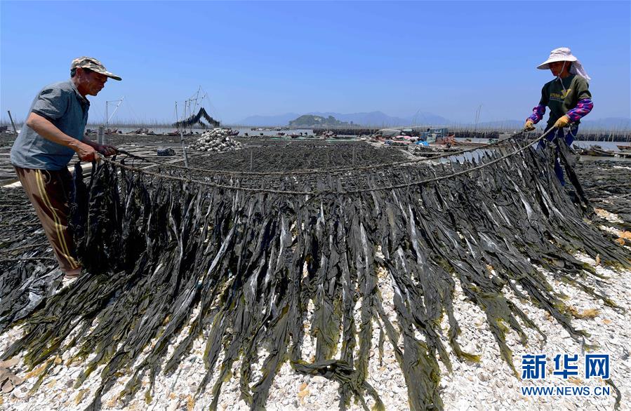 5月17日,在霞浦縣沙江鎮(zhèn)沙江村碼頭,養(yǎng)殖戶(hù)在晾曬海帶。
