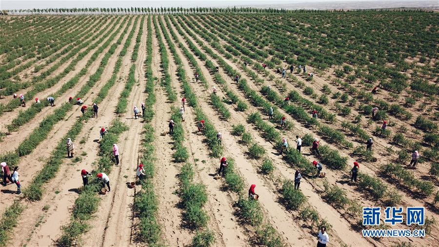 紅寺堡生態(tài)移民區(qū)的移民在百瑞源枸杞種植基地采摘頭茬枸杞(5月30日無(wú)人機(jī)拍攝)。近日,在寧夏吳忠市紅寺堡區(qū)百瑞源枸杞種植基地,頭茬枸杞迎來(lái)采摘收獲季。今年頭茬枸杞采摘期比往年提前20天左右。據(jù)了解,該基地地處紅寺堡生態(tài)移民區(qū),占地3000畝,采摘季節(jié)每天有數(shù)百名當(dāng)?shù)匾泼裨谔镩g采摘?jiǎng)谧?。新華社記者王鵬 攝
