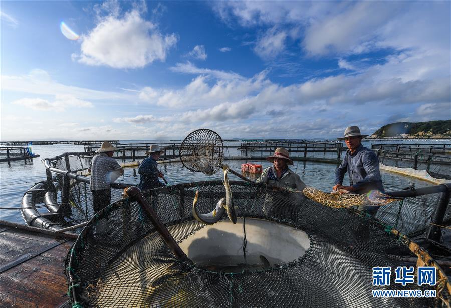 8月18日,南麂島海域內(nèi)的“海上牧場”養(yǎng)殖區(qū)內(nèi),漁民正捕撈大黃魚,處于仿生養(yǎng)殖環(huán)境的大黃魚需要生長2至3年。進(jìn)入8月,浙江省溫州市平陽縣南麂鎮(zhèn)海域上大片的大黃魚、貽貝等特色海產(chǎn)品養(yǎng)殖區(qū)域迎來豐收季節(jié),養(yǎng)殖戶們駕駛漁船在養(yǎng)殖區(qū)海域進(jìn)行打撈收獲,在碧海藍(lán)天下構(gòu)成了一幅“海上牧場”的美麗豐收景象。近年來,南麂鎮(zhèn)政府引導(dǎo)漁民養(yǎng)殖戶充分發(fā)揮“靠海吃海”的資源優(yōu)勢,大力發(fā)展海洋養(yǎng)殖經(jīng)濟(jì)和海島旅游經(jīng)濟(jì),實現(xiàn)了南麂由“生態(tài)美”向“產(chǎn)業(yè)美”,“產(chǎn)業(yè)美”向“經(jīng)濟(jì)美”的轉(zhuǎn)變。同時該鎮(zhèn)堅持以大黃魚、貽貝等為特色產(chǎn)業(yè)支撐,精準(zhǔn)發(fā)展高效海洋養(yǎng)殖業(yè),重點培養(yǎng)一批新型職業(yè)漁民,依靠專業(yè)技術(shù)支持,實現(xiàn)深海仿生養(yǎng)殖,讓好生態(tài)造就好品質(zhì),重點打造南麂養(yǎng)殖品牌,組建營銷網(wǎng)絡(luò),拓展特色海產(chǎn)品市場。新華社記者 徐昱攝