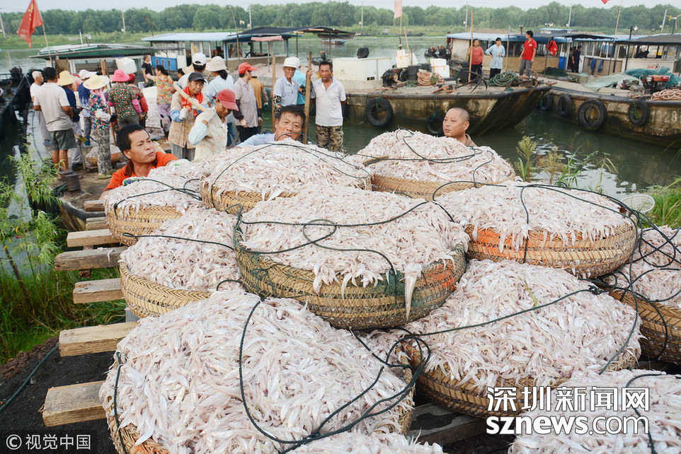 2018年8月16日,安徽巢湖漁民正在裝運捕撈上來的毛魚和銀魚。