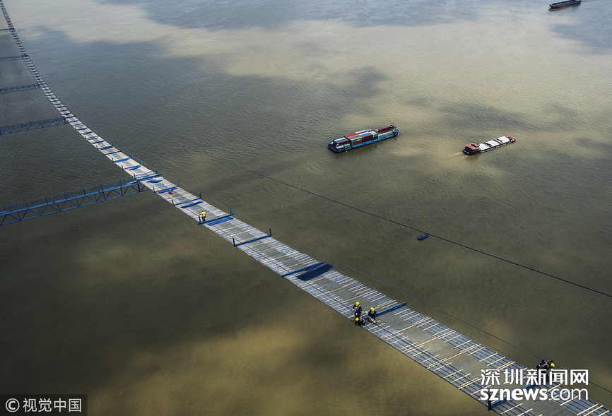2018年5月14日,武漢,武漢楊泗港長(zhǎng)江大橋上空,上部結(jié)構(gòu)施工進(jìn)入貓道面網(wǎng)鋪設(shè)階段,數(shù)十名中鐵大橋局工人在跨江高空拼搏趕超,江面上空的臨時(shí)“吊橋”悄然形成。數(shù)十名工人在長(zhǎng)江上空228米處拼搏趕超,臨時(shí)“天梯”悄然形成。