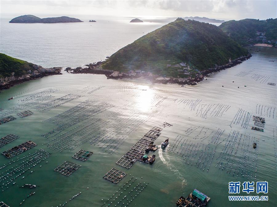 8月19日,空中俯瞰南麂島海域內(nèi)的“海上牧場”養(yǎng)殖區(qū)(無人機拍攝)。南麂島位于浙江東南海域,水質(zhì)好,水溫、鹽度都適合大黃魚等養(yǎng)殖魚類的生長繁殖,因此當?shù)氐乃a(chǎn)品也一直保持了較高的品質(zhì)和口碑。進入8月,浙江省溫州市平陽縣南麂鎮(zhèn)海域上大片的大黃魚、貽貝等特色海產(chǎn)品養(yǎng)殖區(qū)域迎來豐收季節(jié),養(yǎng)殖戶們駕駛漁船在養(yǎng)殖區(qū)海域進行打撈收獲,在碧海藍天下構(gòu)成了一幅“海上牧場”的美麗豐收景象。近年來,南麂鎮(zhèn)政府引導漁民養(yǎng)殖戶充分發(fā)揮“靠海吃海”的資源優(yōu)勢,大力發(fā)展海洋養(yǎng)殖經(jīng)濟和海島旅游經(jīng)濟,實現(xiàn)了南麂由“生態(tài)美”向“產(chǎn)業(yè)美”,“產(chǎn)業(yè)美”向“經(jīng)濟美”的轉(zhuǎn)變。同時該鎮(zhèn)堅持以大黃魚、貽貝等為特色產(chǎn)業(yè)支撐,精準發(fā)展高效海洋養(yǎng)殖業(yè),重點培養(yǎng)一批新型職業(yè)漁民,依靠專業(yè)技術(shù)支持,實現(xiàn)深海仿生養(yǎng)殖,讓好生態(tài)造就好品質(zhì),重點打造南麂養(yǎng)殖品牌,組建營銷網(wǎng)絡,拓展特色海產(chǎn)品市場。新華社記者 徐昱攝