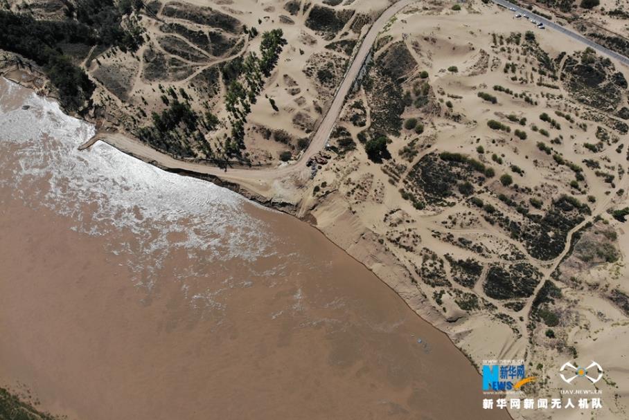 航拍黃河托克托段兩岸風(fēng)光,西岸是浩瀚沙漠。新華網(wǎng) 張偉 攝