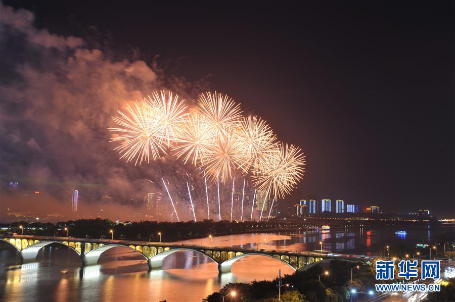 9月19日晚,湖南省長(zhǎng)沙市在湘江橘子洲舉辦焰火晚會(huì),絢麗的焰火與湘江兩岸的城市夜景交相輝映。