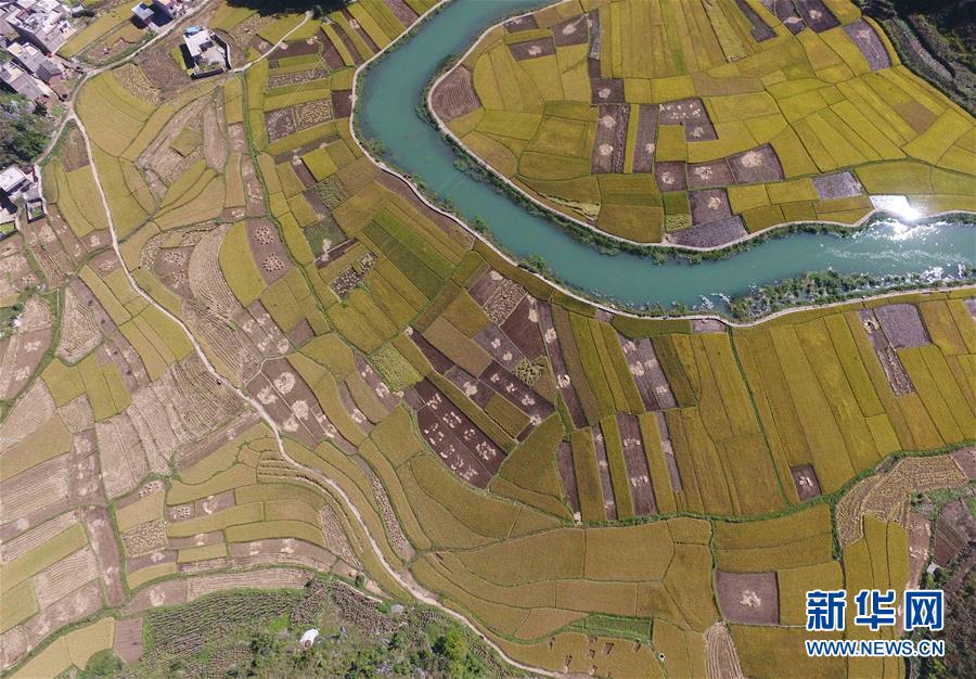 這是廣南縣八寶鎮(zhèn)壩龍村的稻田景色(9月20日無人機(jī)拍攝)。 云南省文山壯族苗族自治州廣南縣八寶鎮(zhèn)今年種植優(yōu)質(zhì)水稻22000余畝,秋收季節(jié),田野里一片金黃,景色如畫。 新華社記者楊宗友攝