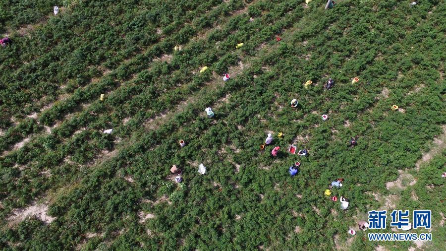 9月16日,阜城縣王集鄉(xiāng)南張莊村農(nóng)民在采摘辣椒(無(wú)人機(jī)拍攝)。近年來(lái),河北省阜城縣王集鄉(xiāng)在推進(jìn)產(chǎn)業(yè)富民過程中,積極引導(dǎo)農(nóng)民調(diào)整農(nóng)業(yè)產(chǎn)業(yè)結(jié)構(gòu),按照品種特色化、種植規(guī)?;?、產(chǎn)銷一體化的“公司+基地+農(nóng)戶”的經(jīng)營(yíng)模式,鼓勵(lì)農(nóng)民發(fā)展特色辣椒種植,推行“訂單種植”模式,開辟出了一條農(nóng)民創(chuàng)收新路徑。目前,阜城縣王集鄉(xiāng)辣椒種植面積3100余畝,每畝年收益2500元以上,帶動(dòng)當(dāng)?shù)剞r(nóng)民實(shí)現(xiàn)增收。新華社記者朱旭東攝